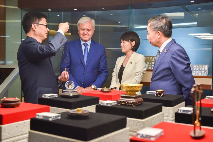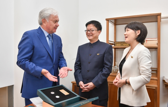 了解阿利莫夫先生的人都知道,他不仅是一名杰出的历史学家、外交官,还是一位浪漫的诗人。在他新出版的著作《我所珍爱的那一切》诗文集中,就展现了他对文化和艺术的深刻理解。怀着对中国文化的浓厚兴趣,阿利莫夫先生饶有兴致地参观了汉今国际的作品陈列室。在认真听取诸多获奖作品的创意来源后,阿利莫夫先生竖起大拇指说:“这才是文创作品该有的样子。”从“一带一路”国际合作高峰论坛到世界杯与奥运会,从迪士尼、环球到传统文化与生肖贺岁,传统文化现代化、中国文化国际化的诸多创意呈现让阿利莫夫先生频频称赞。他认真地说:“远大的理想、文化的传承,加上精益求精的工艺,都是汉今国际的宝贵财富。”