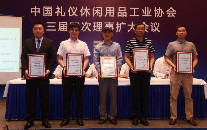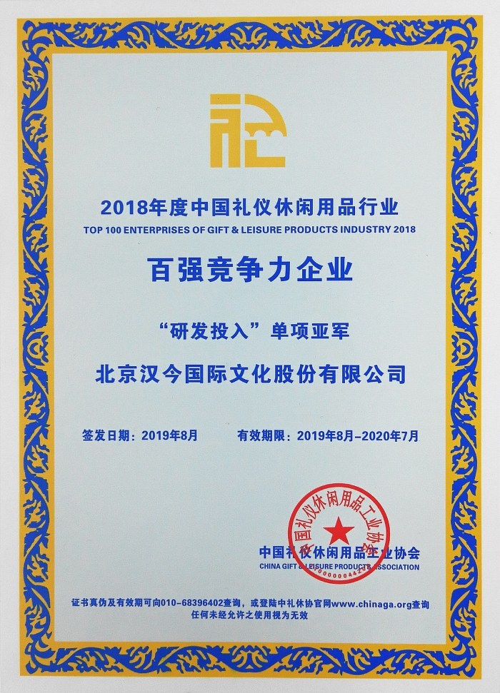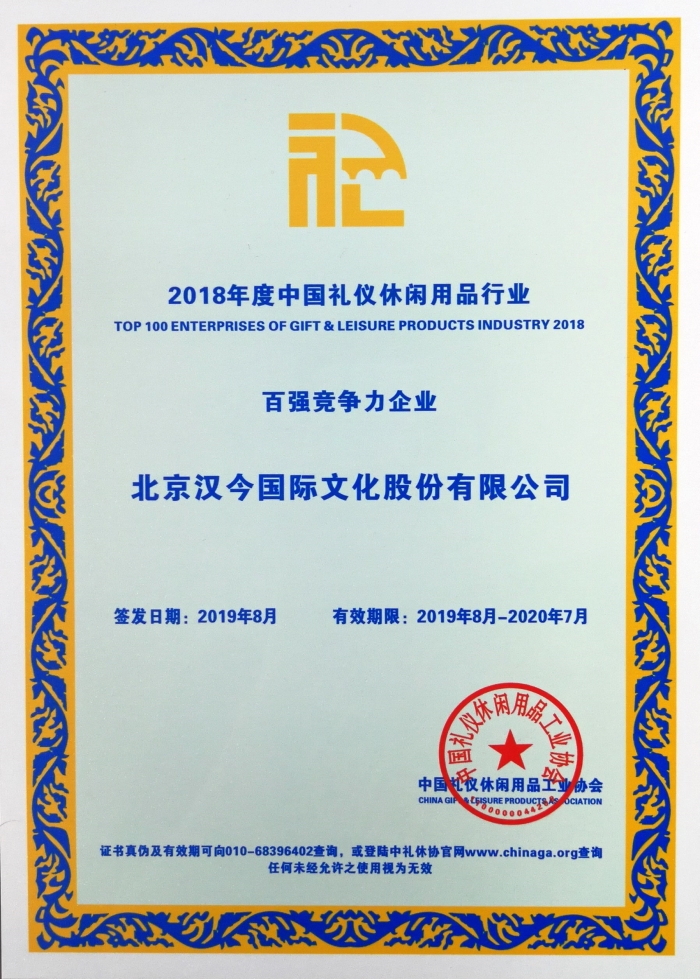 在近日召开的《中国礼仪休闲用品工业协会三届三次理事扩大会》上,北京汉今国际文化股份有限公司荣获“2018年度中国轻工业礼仪用品行业十强企业”与“2018年度中国礼仪休闲行业百家竞争力企业”荣誉称号。