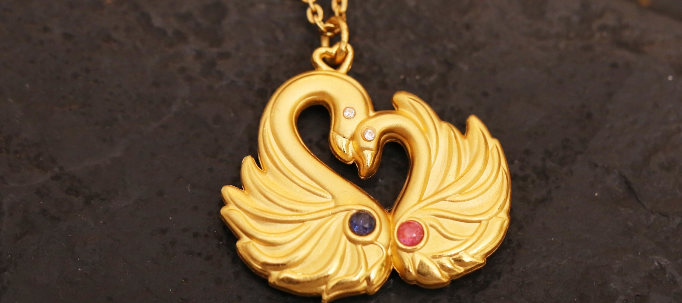 “Gold Pendant with Two Swans”: As the swan exemplifies the most faithful love in the world, this Pendant is mainly designed to be a love token for lovers. The posture of these two swans is like two lovers whispering to each other, full of happiness. The two embedded diamonds symbolize mutual affinity from two lovers.